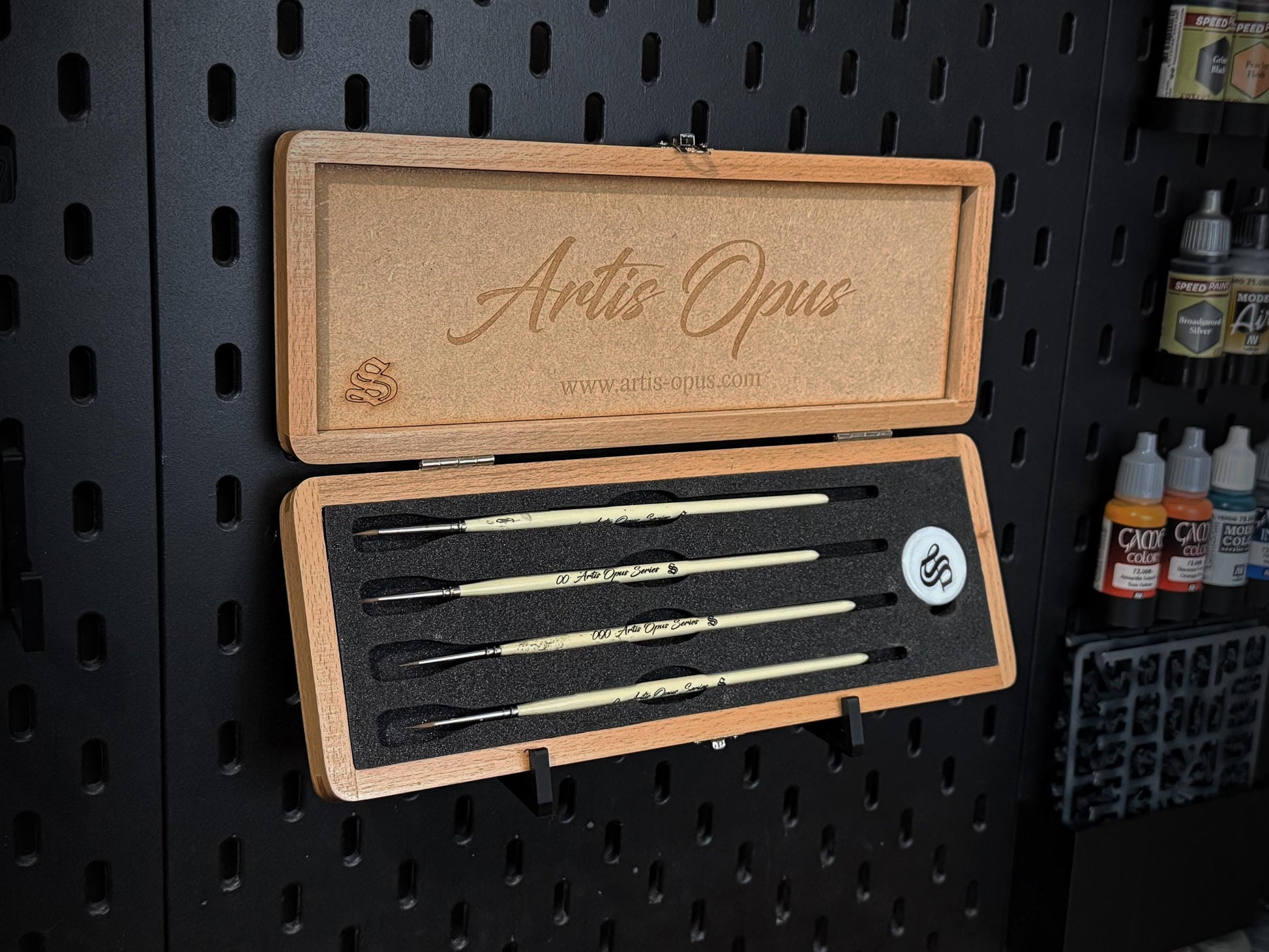 This Artis Opus Box Display Hook is designed to fit the IKEA SKÅDIS pegboard and comes with two brackets that can be positioned at any distance to hold a regular Artis Opus Brush Box.