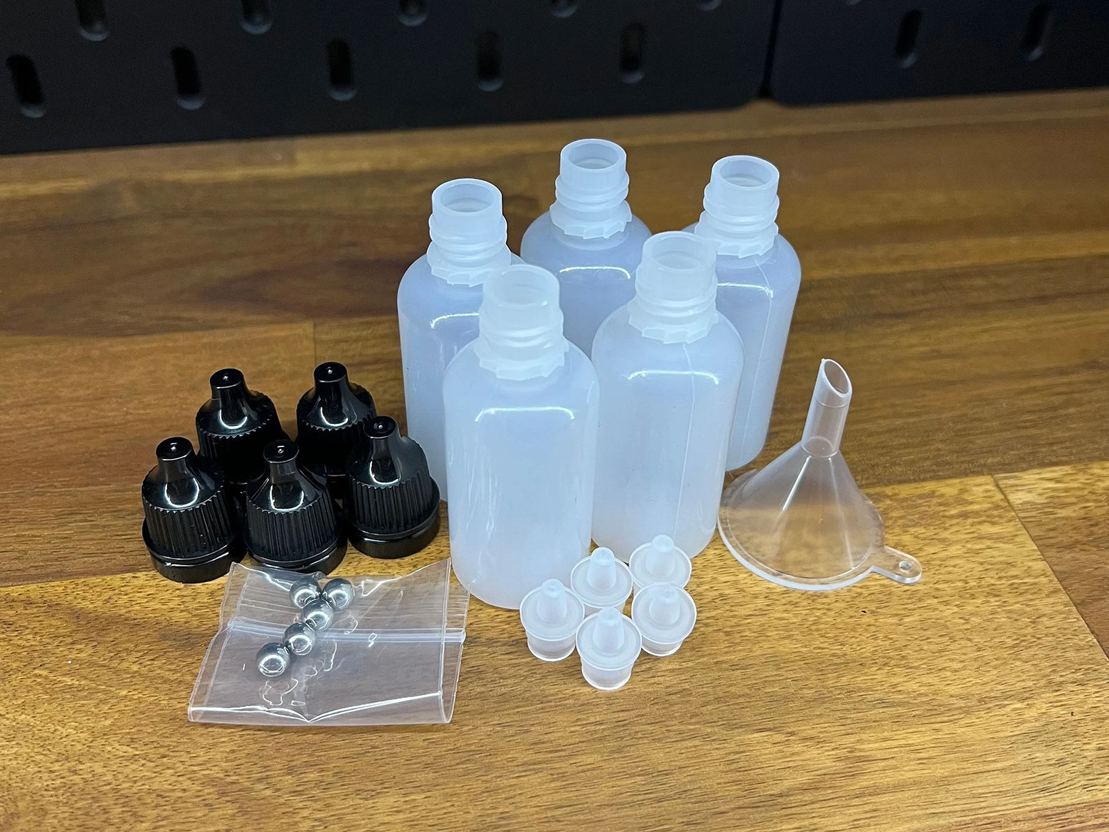 - 5 Pack – 5 dropper bottles, 5 nibs, 5 lids, 5 agitator balls, and 1 free funnel