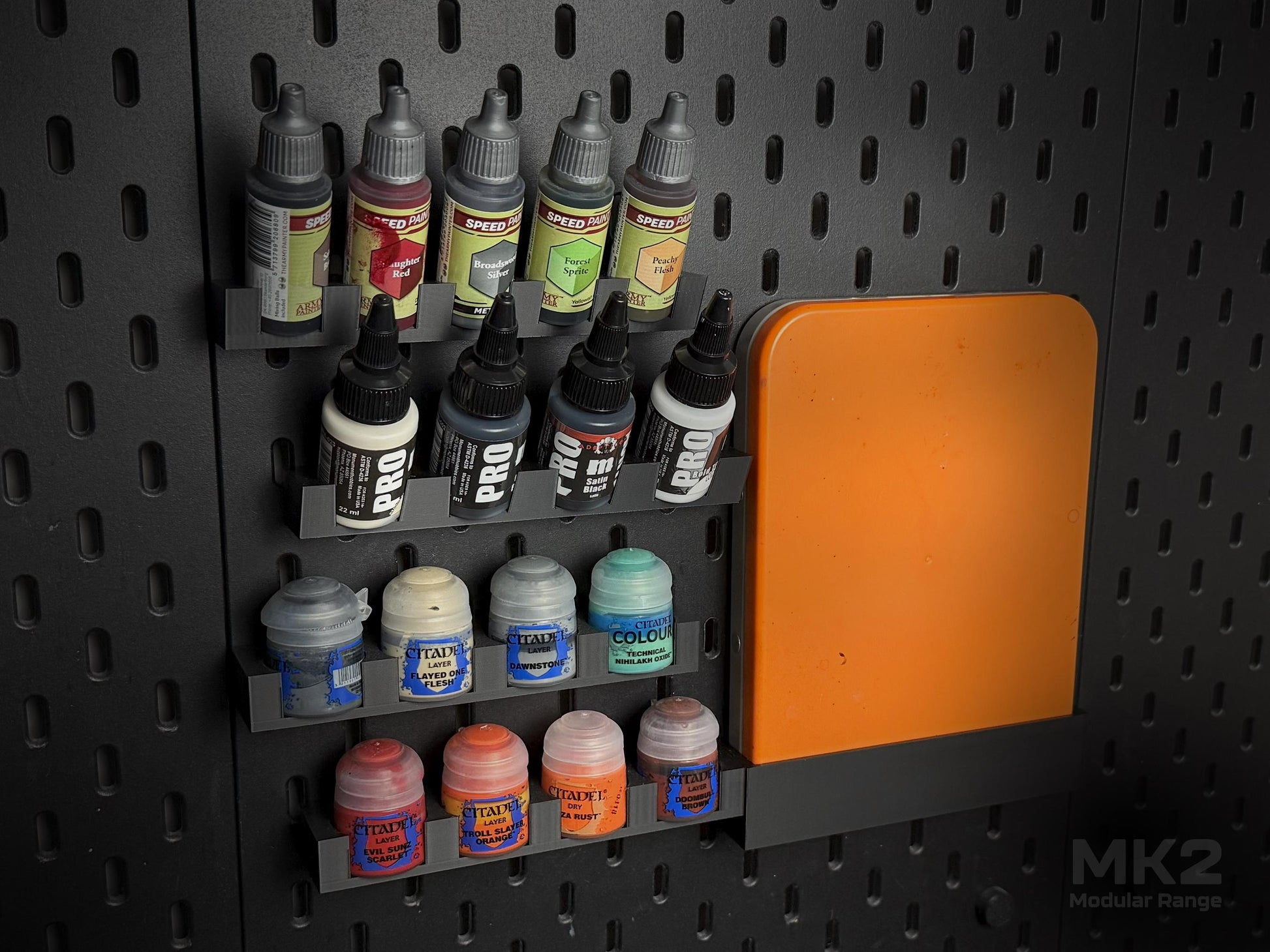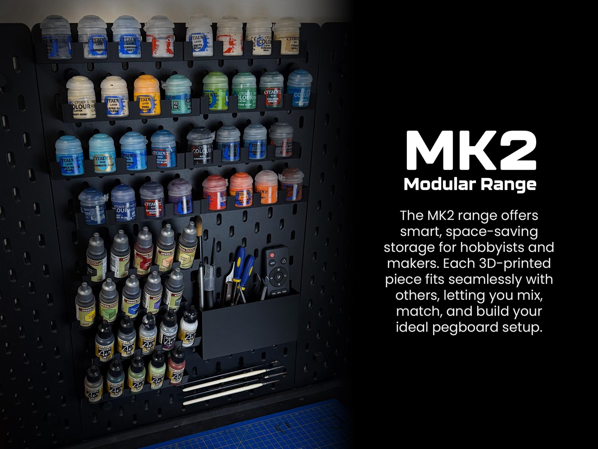 All MK2 products are designed to sit flush next to each other, maximising your pegboard space. This shelf aligns perfectly with other MK2 components — including the Citadel paint pot holder, dropper bottle holder, and more — allowing you to build a fully customised, space-efficient storage system.
